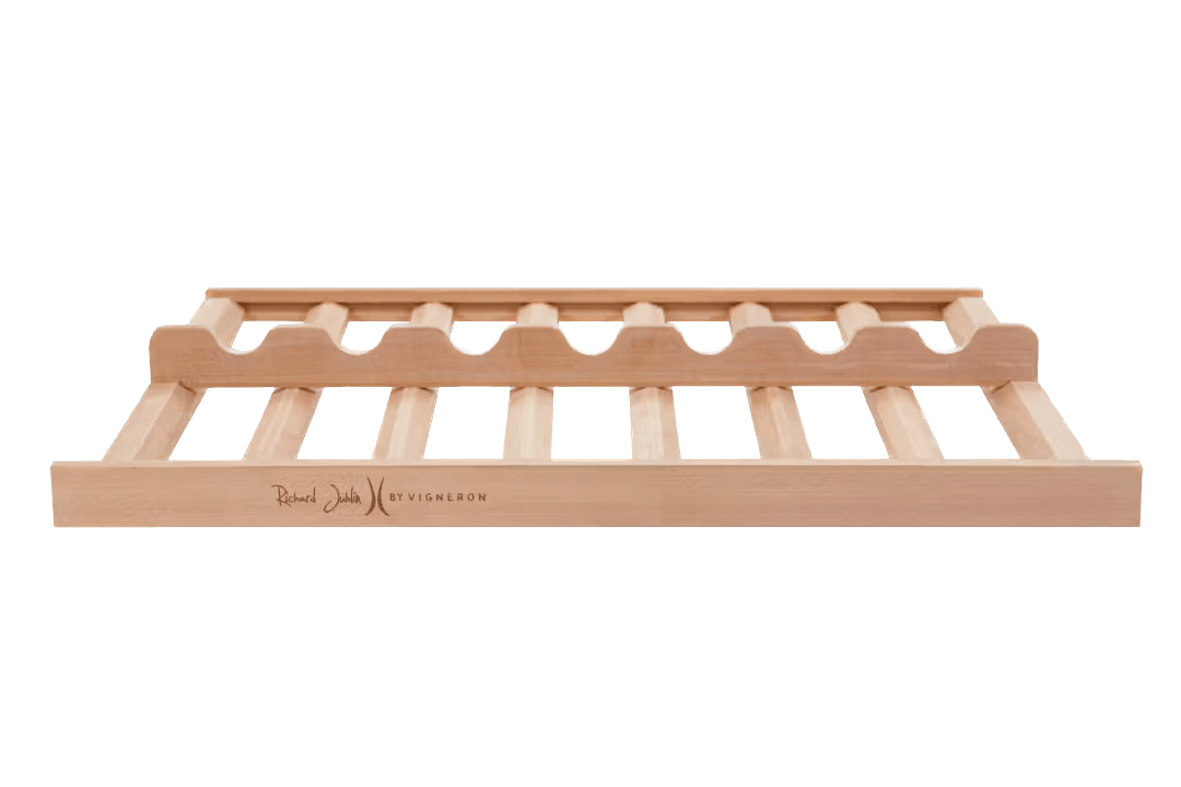 Vigneron har tillsammans med Richard Juhlin tagit fram denna speciella champagnehylla. Träribban i mitten av hyllan låter dina champagneflaskor oavsett form och storlek lagras vibrationsfritt på bästa sätt.