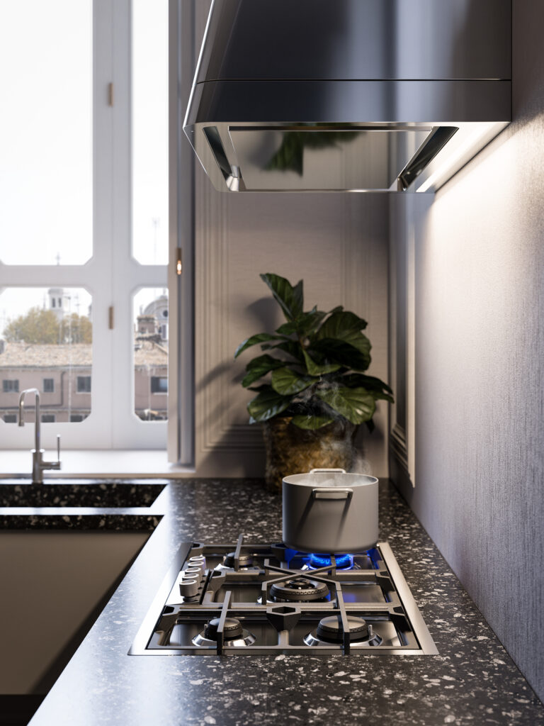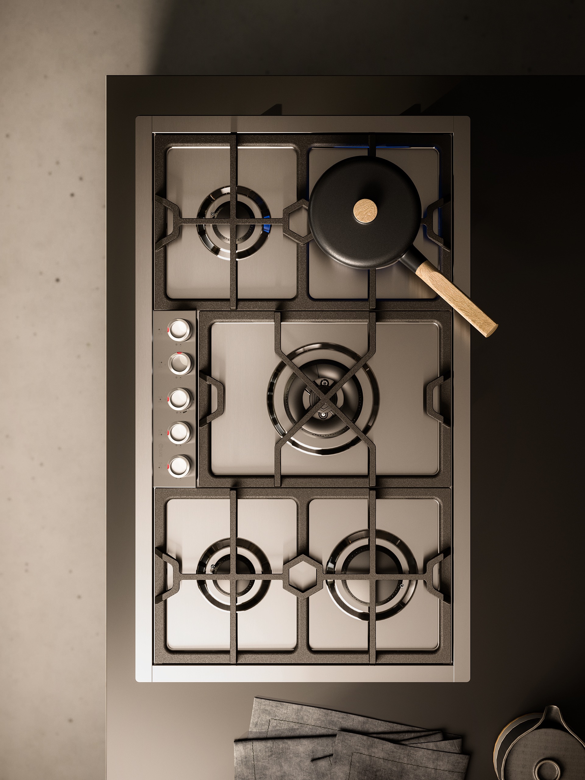HCPMT-seriens hällar har raka, kraftiga brännargaller. Hällens bottenplatta är i rostfritt och vreden är i Panoramagic seriens runda släta vred, samma som på spisarna men något mindre.