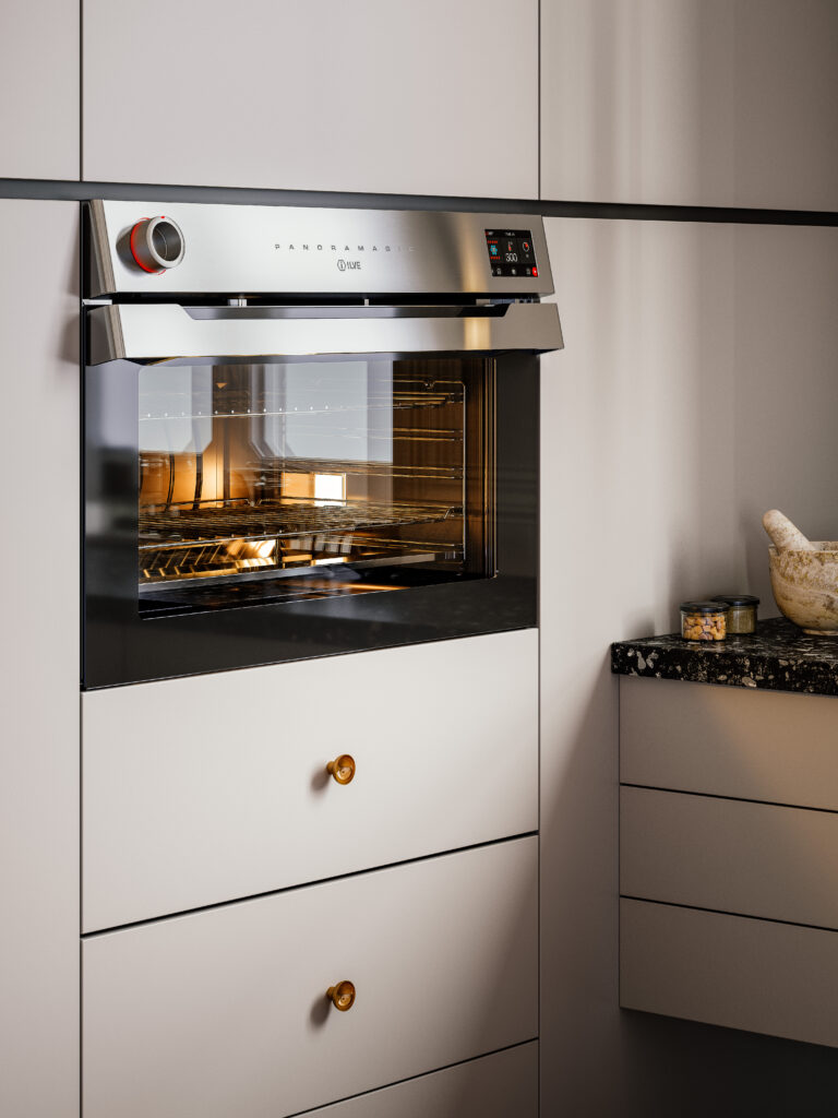Panoramagic karaktäriseras av sin unika form med den vinklade panelen med LED-belysta stora vred och det mäktiga handtaget som också blir del i den unika formen. Maxiugnen 90 är en av våra största ugnar någonsin.