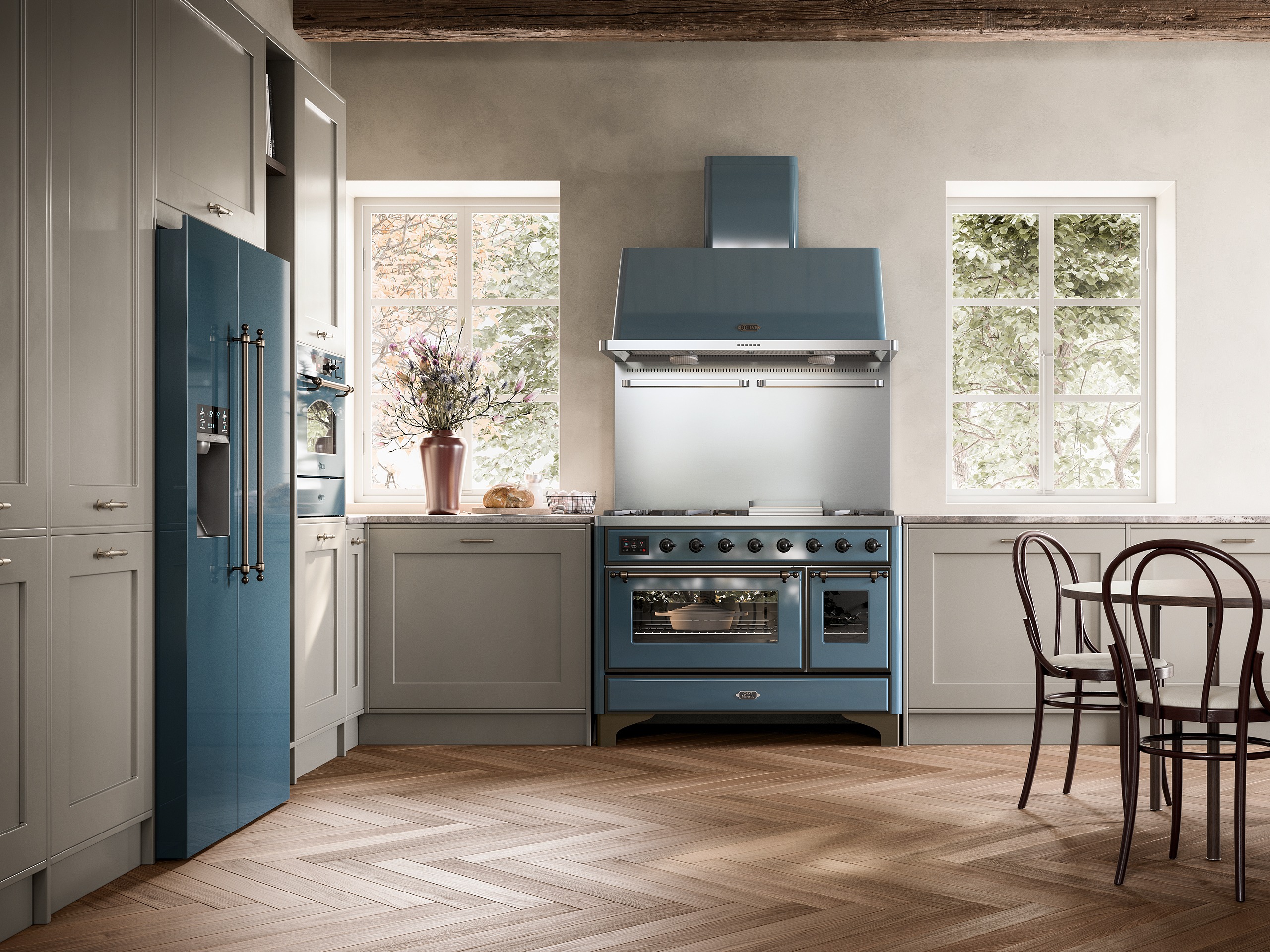Majestics köksfläkt AM matchar seriens spisar och passar dess något djupare mått. Vägghängd köksfläkt som finns i alla ILVEs standardfärger och är dessutom utrustad med infraröda värmelampor. Du kan anpassa din fläkt i en unik färg kan du även beställa enligt färgkartan RAL Classic och välja bland över 200 färger.