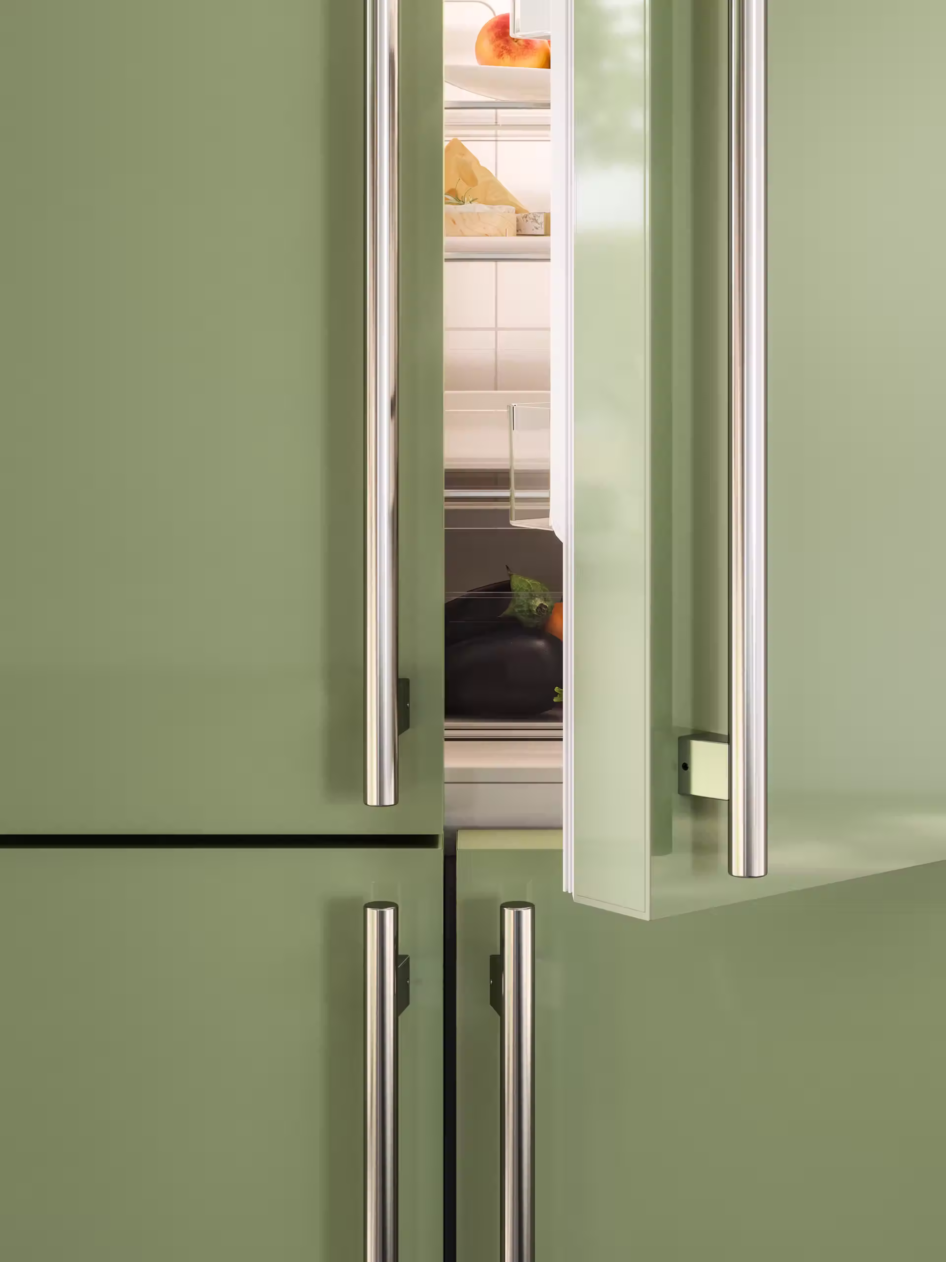 En kyl och frys med french door ger nya möjligheter för kylförvaring. Med kyl över hela skåpets övre del ger de extra breda hyllorna plats för stora brickor eller skrymmande livsmedel som hel fisk eller stora köttbitar. Den nedre delens frys med två dörrar ger samtidigt snabb åtkomst till frysens godsaker.