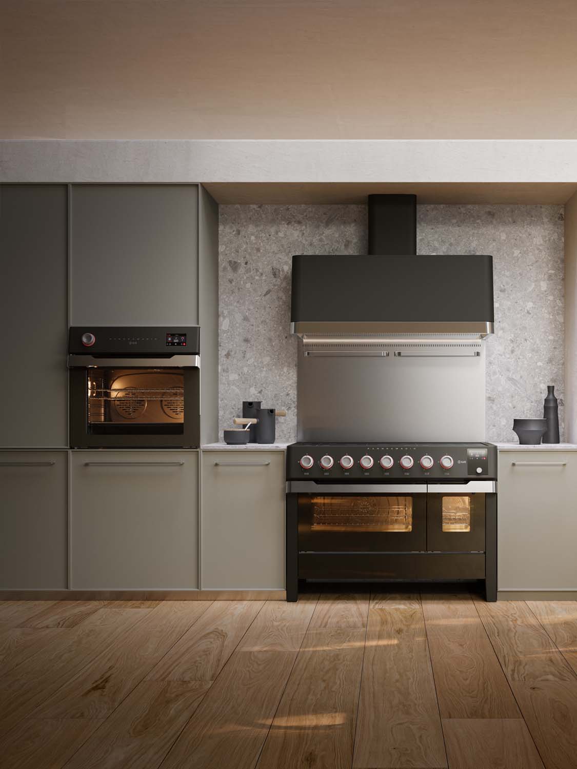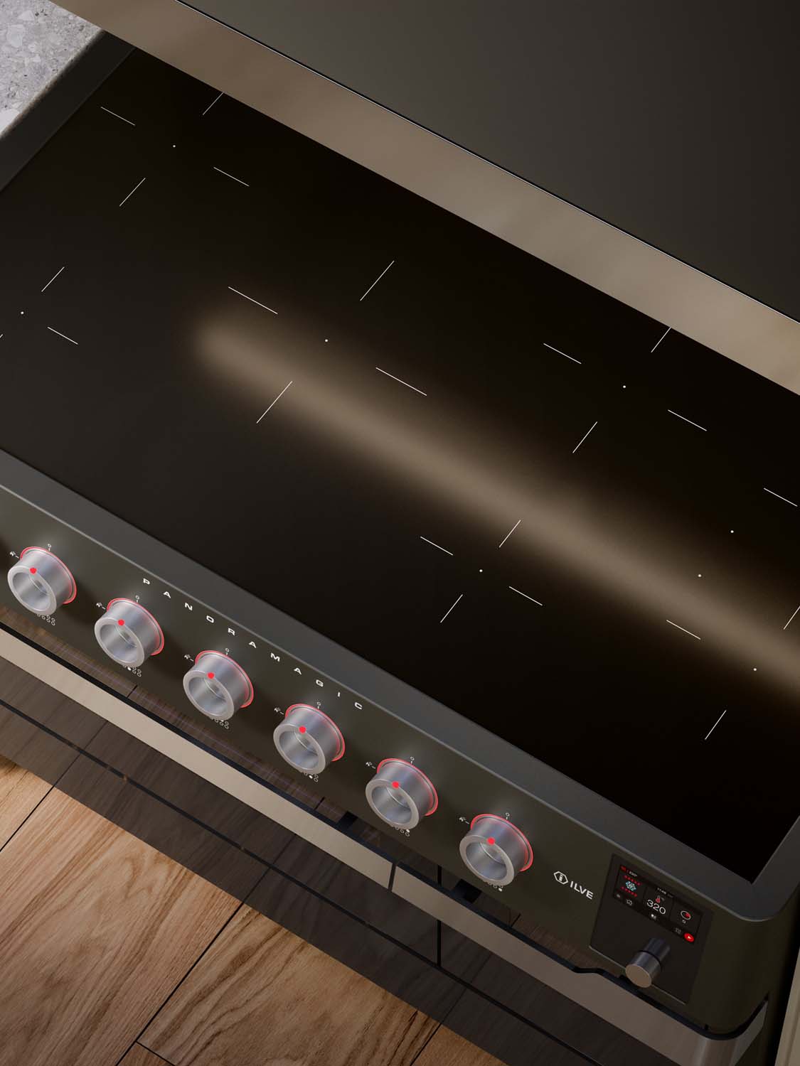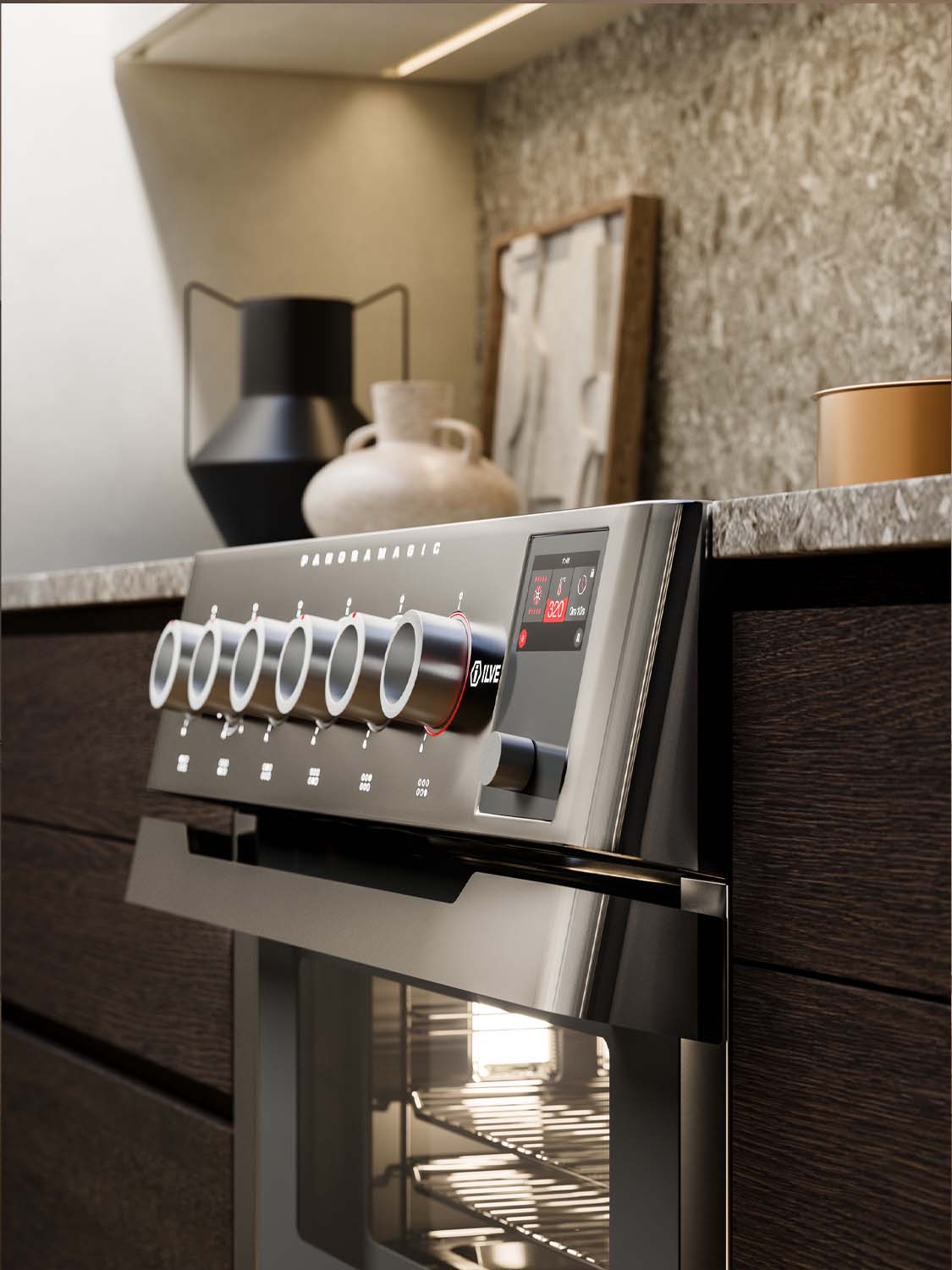 Panoramagic har en unik design som kombinerar de professionella kökens tekniska egenskaper med den italienska designkulturen. Den karaktäristiska och lutande kontrollpanelen med stora LED-upplysta vred och det funktionella handtaget som också blir en fin designdetalj skapar ett helt nytt uttryck. Panoramagic med en nutida och professionell form blinkar också tillbaks mot 70-talet och den modell av Panoramagic som lanserades då!